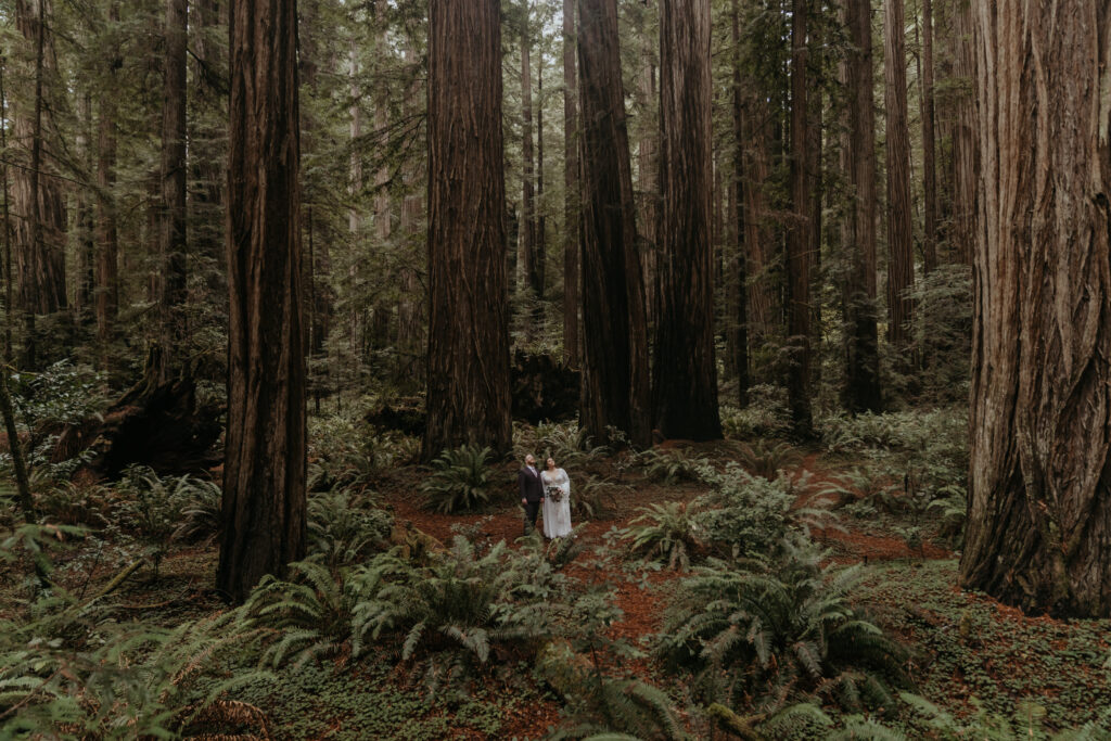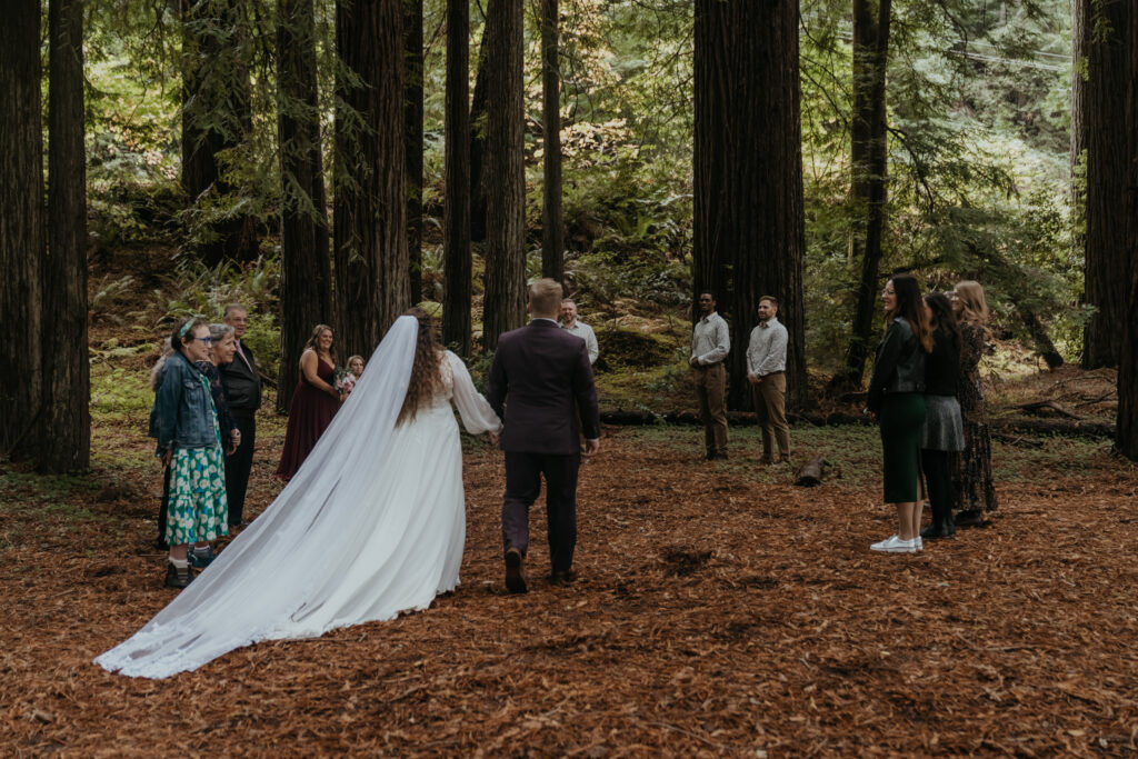 Their ceremony in the redwood grove was everything. As guests arrived, I noticed thick storm clouds gathering overhead and quietly tucked clear umbrellas nearby, just in case.