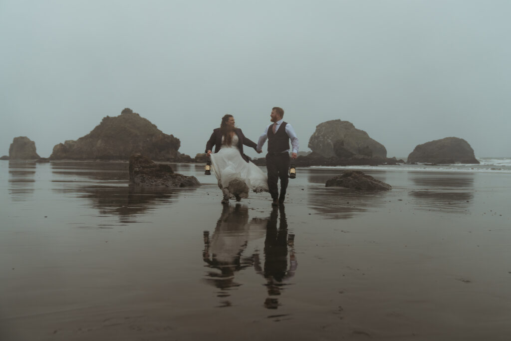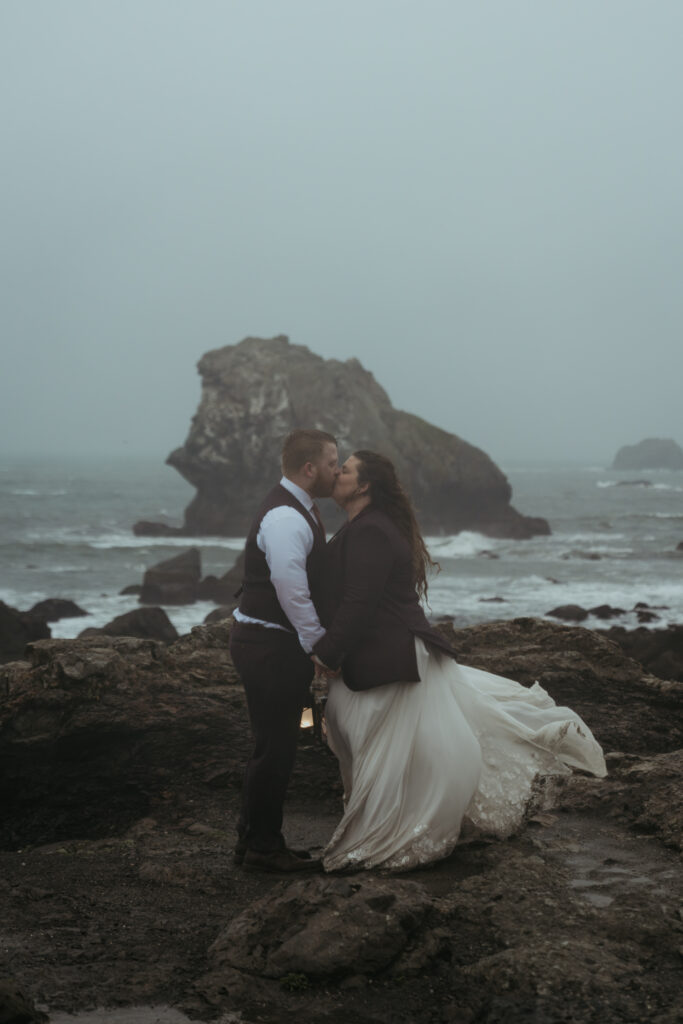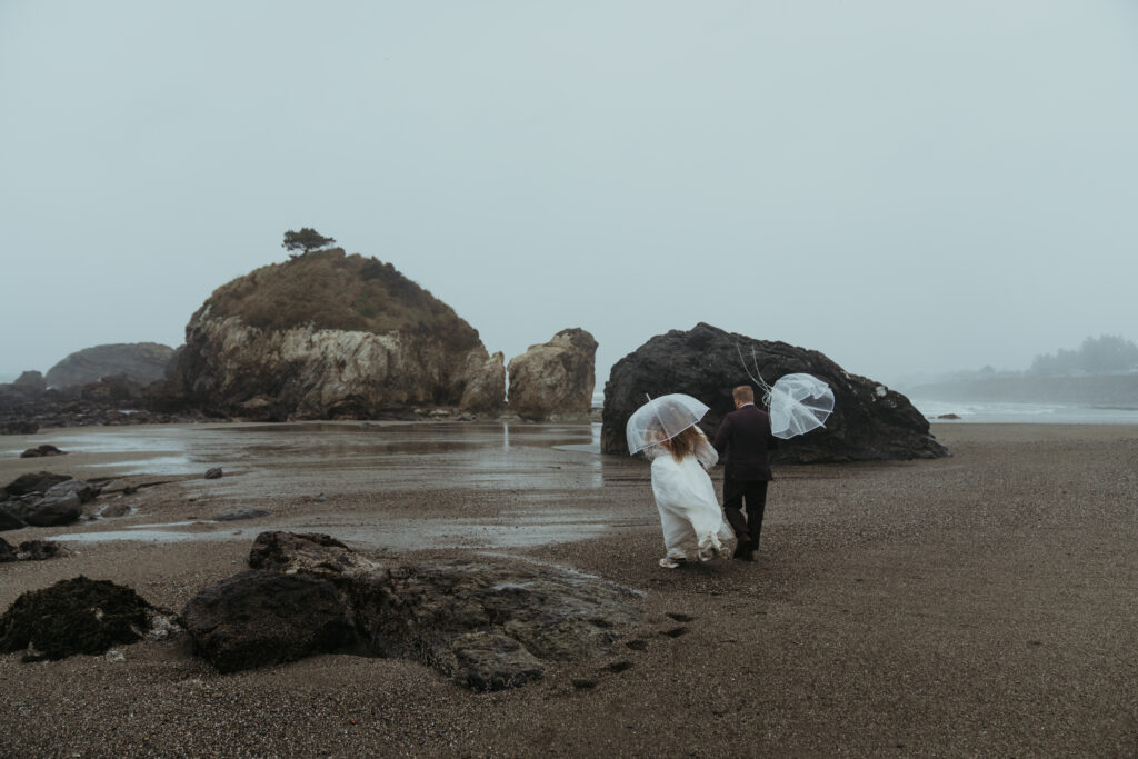 That afternoon, we headed to the beach for sunset portraits and the planned first dance and champagne toast with family. Instead, we were greeted by wind so fierce we could barely open our car doors and rain that had completely different ideas about our timeline. We knew there was rain in the forecast, but storms on the Northern California coast can change fast. This wind was not what we had expected to face.