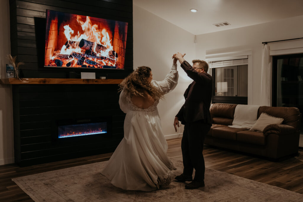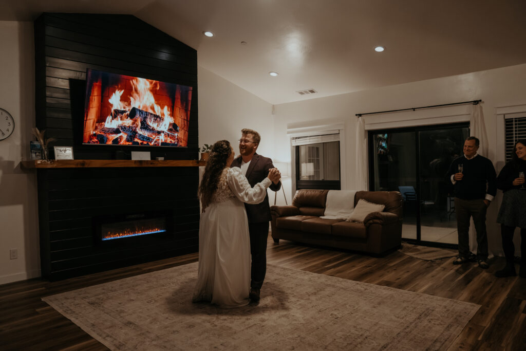 Their loved ones immediately sprang into action moving furniture, clearing the living room, creating a makeshift dance floor. Kate’s little niece even found the remote and put a fireplace video on the TV in the background. The energy in that space was electric. It felt like this was how it was always meant to happen. Nobody was missing the beach. Everyone was exactly where they should be.